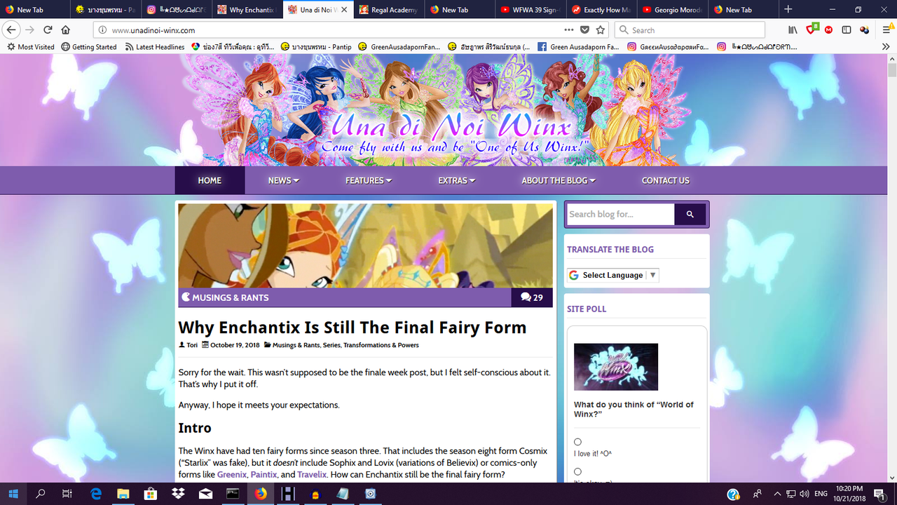 Founded by The Oblivious Prattler just before the world premiere of season 4 in Italy, this fan blog covered all sorts of Winx discussion: episode summary/reviews, news, various opinions of all things Winx, and debate about Roxy's status. At its peak, Una di Noi Winx even had Facebook, Instagram, Tumblr, and Twitter pages :-)