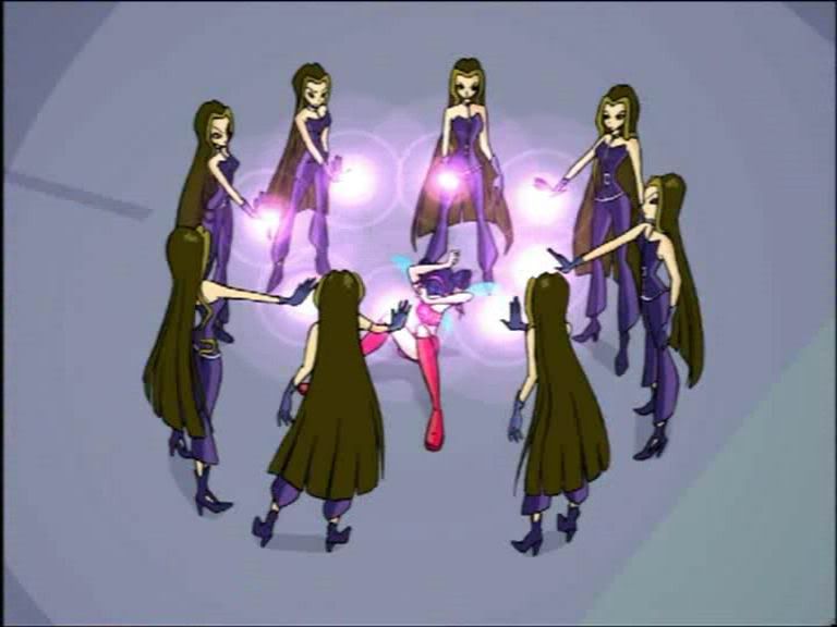 Anyways, un-transformed Stella tells the girls to keep the Trix busy while she's getting the water, while Miele is just standing around. Stormy uses her powers against Musa, Tecna, and Flora (and they're all transformed), as Stella gets the water. Icy sees this and shoots at her goblet to empty it. Stormy shoots at Musa, and Flora makes vines grow around Stormy, but Stormy wastes no time in getting rid of them. Icy shoots icicles at Bloom, affixing her to a cave wall with lots of ice, a la when she lost her Dragonfire back in S1. Darcy multiplies herself over and over, and surrounds Musa all by herself. Deja vu, anyone? Musa is confused by all the extra Darcies, and then she's tied up with a purple rope. Still wingless Stella's got some more water in the goblet, so Icy fires at the goblet again, this time not only turning the goblet over, but also sending it flying pretty far before shattering on the rocks, after Stella runs herself into a tree while chasing the goblet. Ouch, that's gotta hurt.